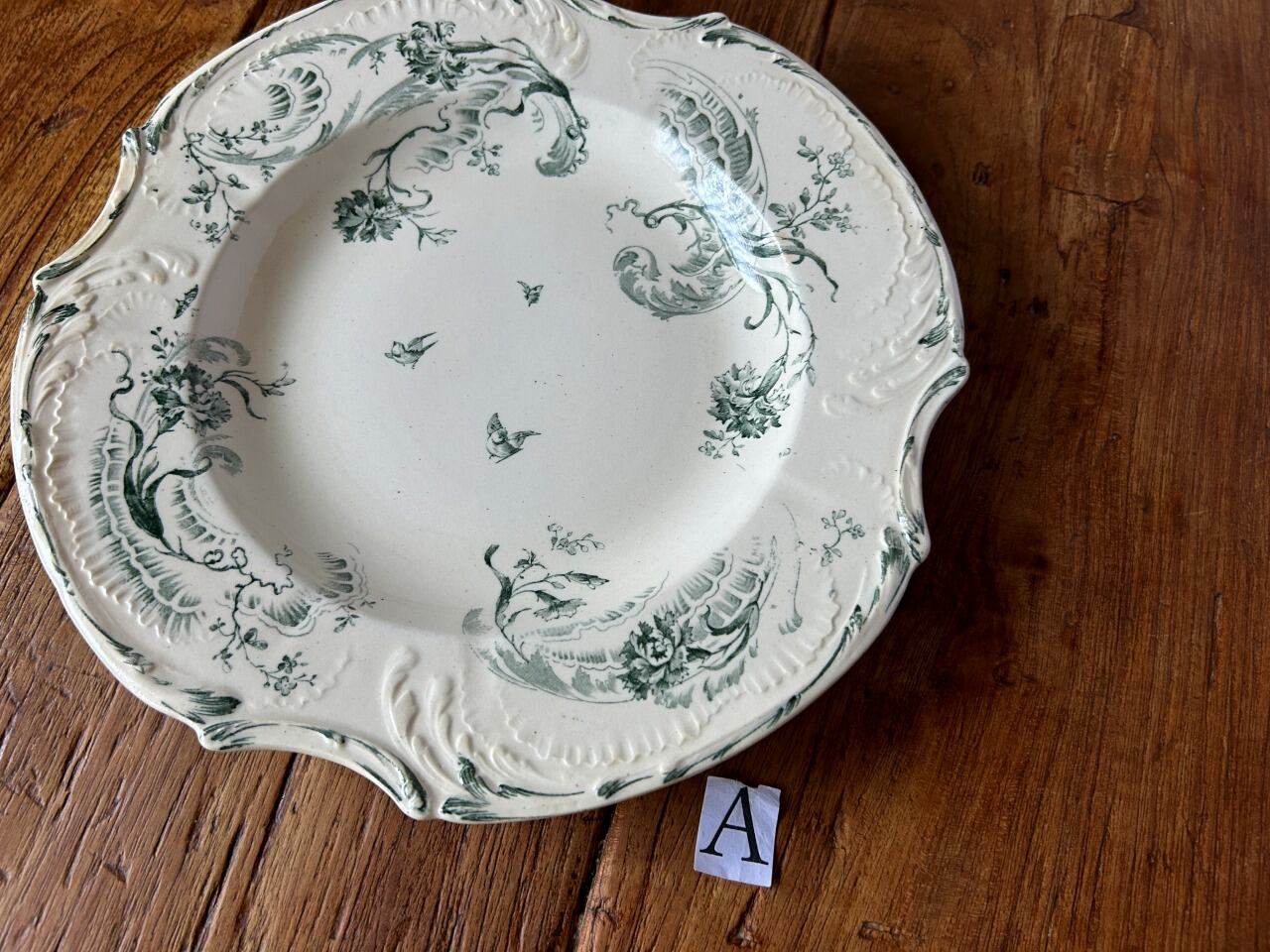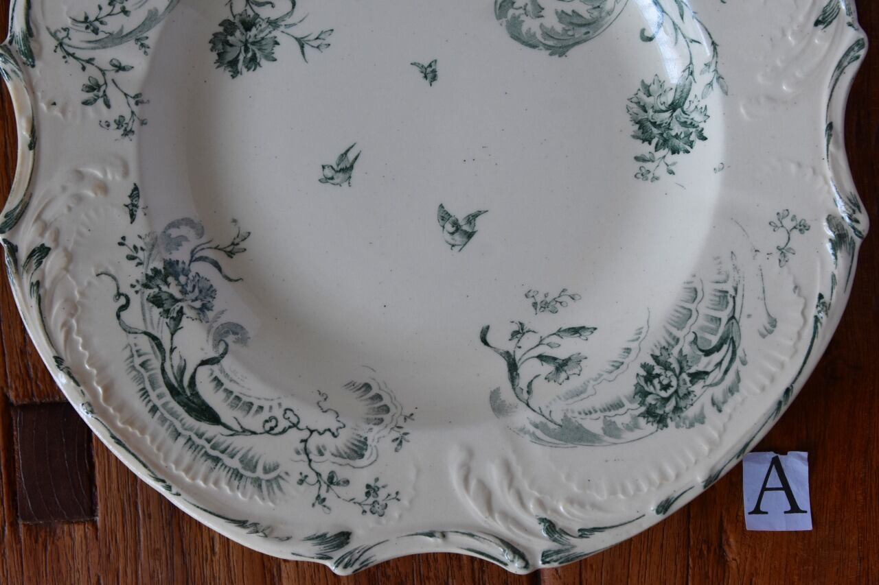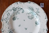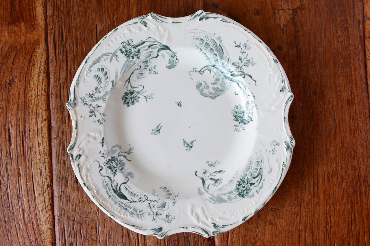フランス、ジアン窯のモスグリーンの絵柄が美しいプレートをご紹介します。クリーム色を基調としたお皿にレリーフが施されています。お皿の中央に描かれている解き放たれた鳥が美しく、また可愛いらしいポイントでもあります。こちらのお皿は1875年頃に作られたロカイユスタイルのお品です。上品で高貴なフォルムが特徴です。