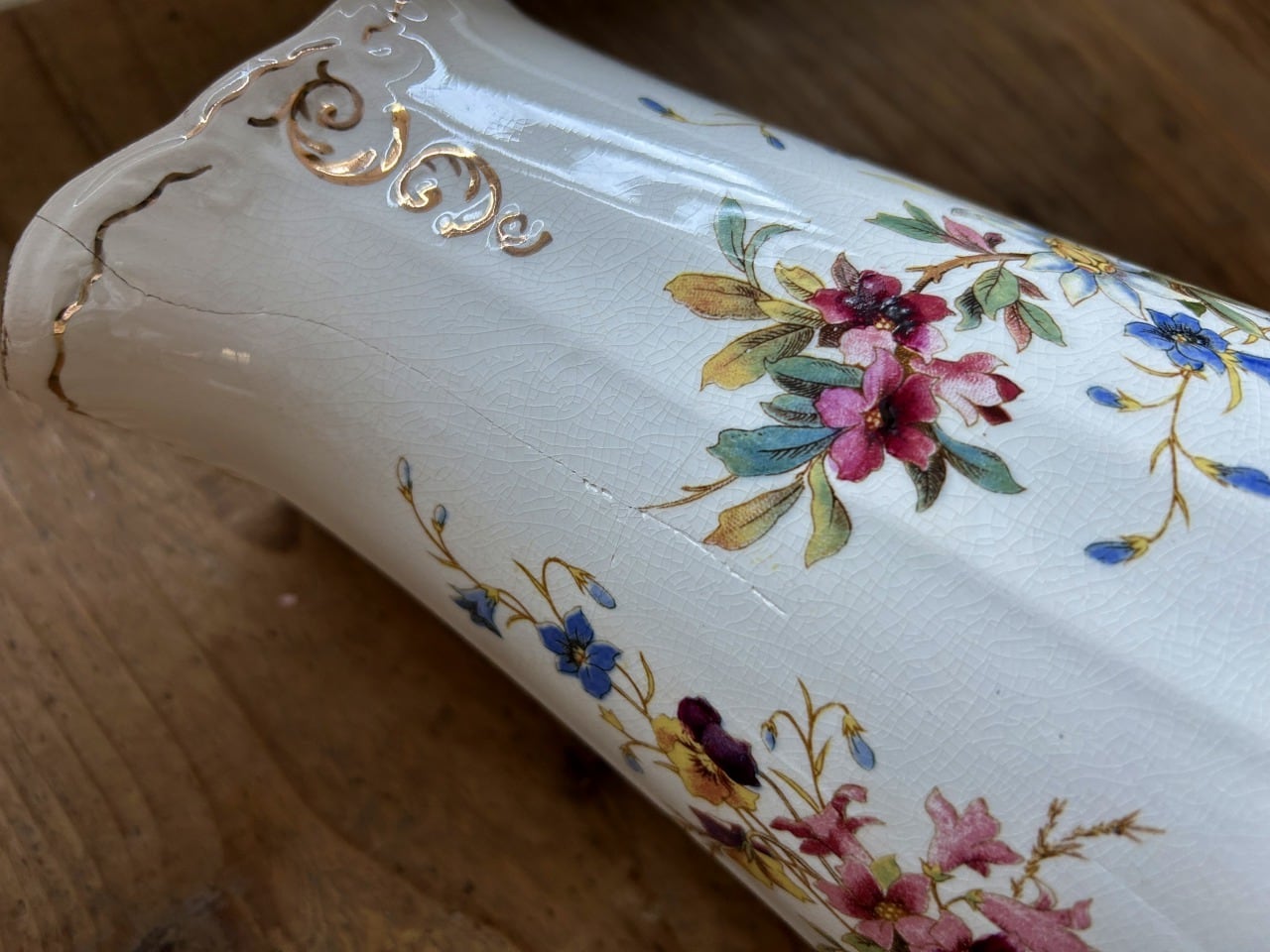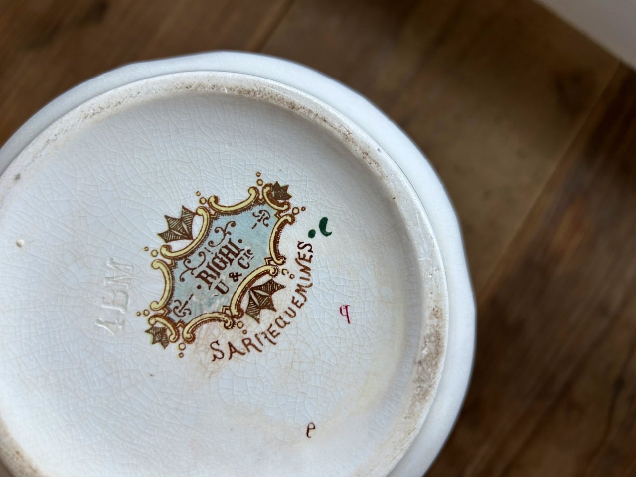サレグミンヌからカラフェのご紹介です。RIGHIというモデルのもので、20世紀初頭、特に1900年代に製造されたと考えられます。このモデルは、アルプスのエーデルワイスなどの高山植物をモチーフにした豊かな花柄装飾が特徴で、アール・ヌーヴォー様式の影響を受けています。とてもかわいらしいです☺︎