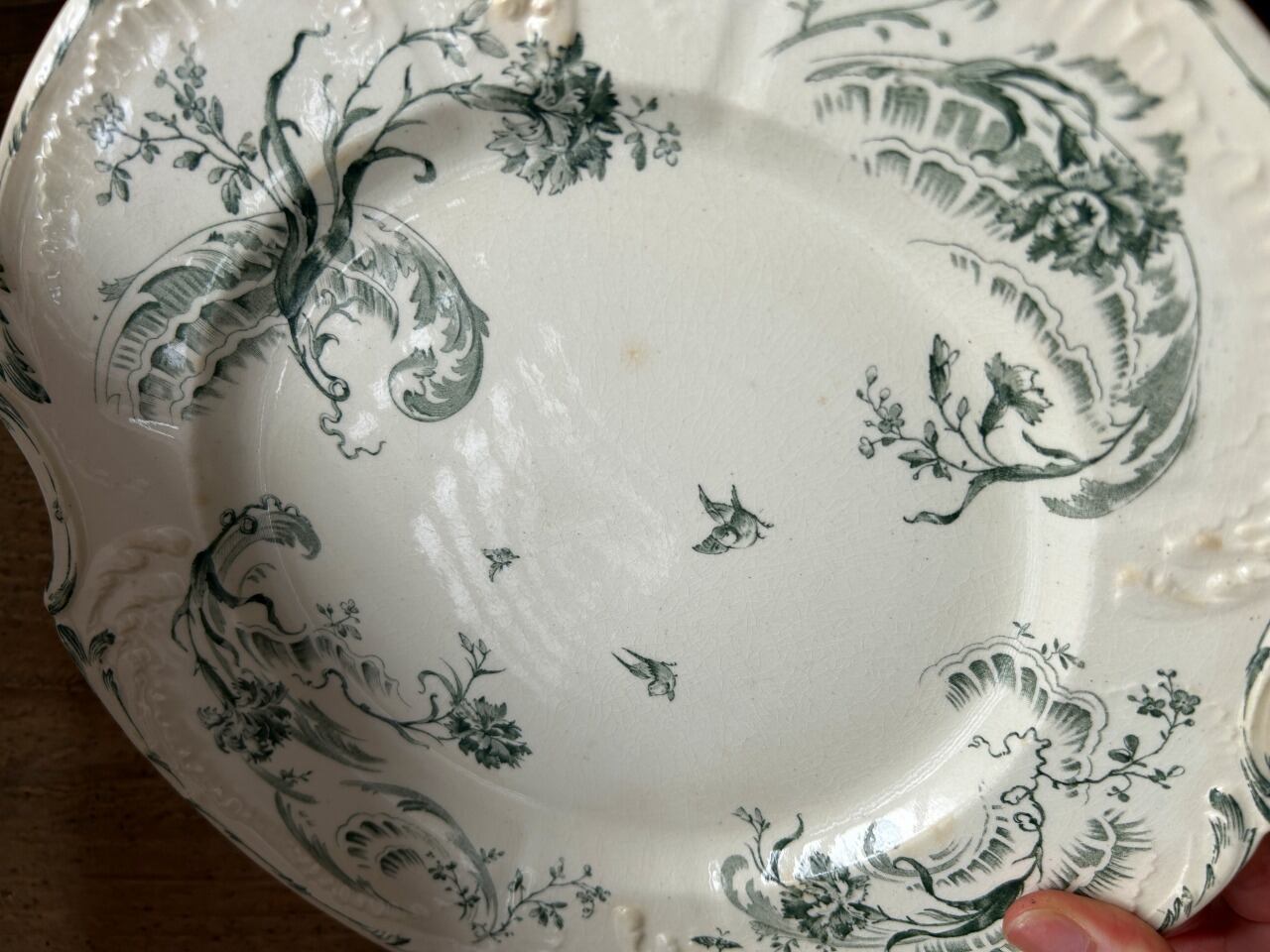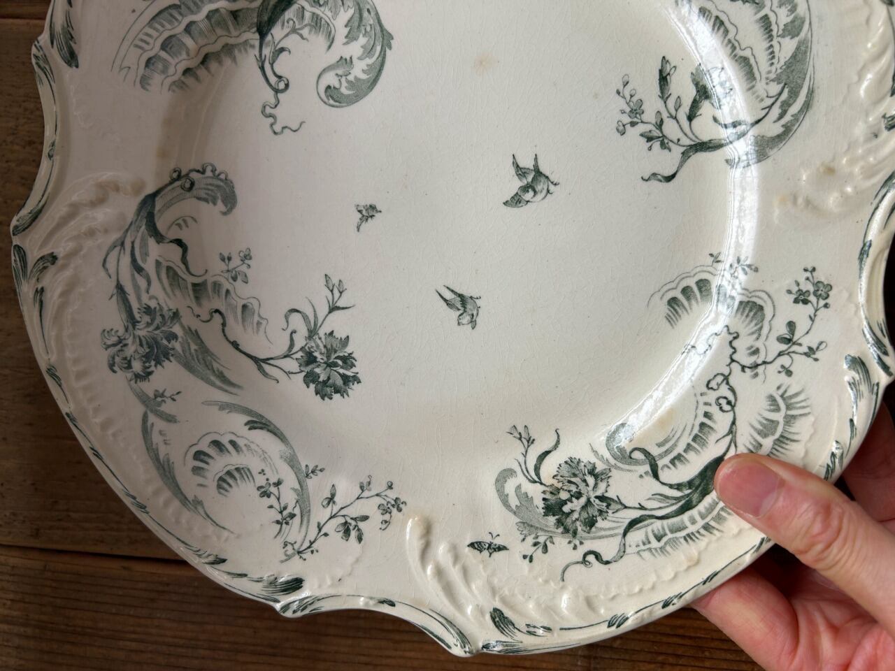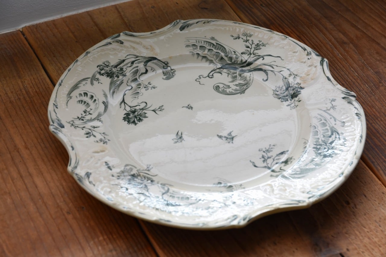 フランス、ジアン窯のモスグリーンの絵柄が美しいプレートをご紹介します。クリーム色を基調としたお皿にレリーフが施されています。お皿の中央に描かれている解き放たれた鳥が美しく、また可愛いらしいポイントでもあります。こちらのお皿は1875年頃に作られたロカイユスタイルのお品です。上品で高貴なフォルムが特徴です。
