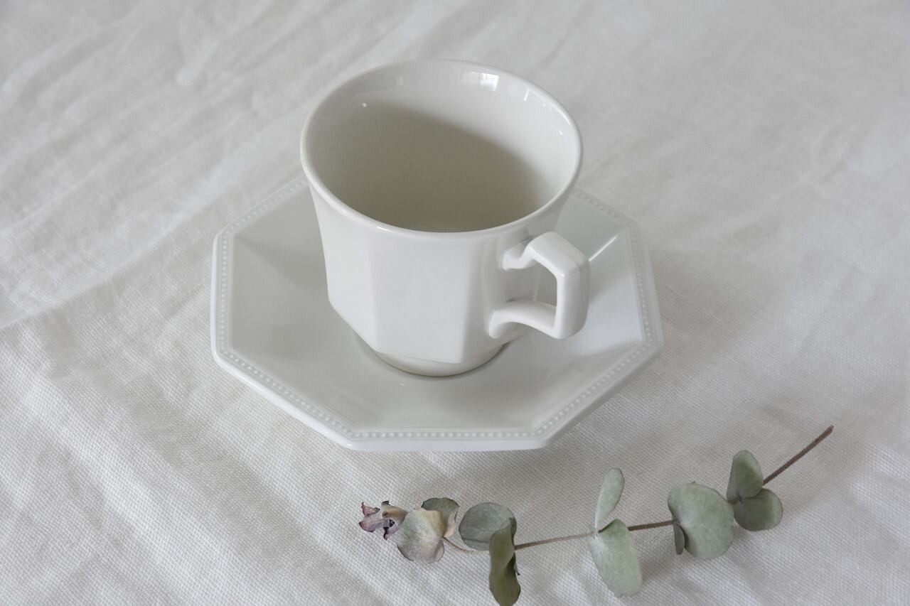 ソーサーのオクトゴナルの形とパール柄の縁取りもかわいらしく魅力的です。